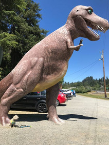 Hitching is becoming easier too. We finally left around 9:30am and arrived around 2pm. A little later than I would have liked, but fortunately, this is another gorgeous drive with very little traffic. Weather ranged from mid-50’s to mid-70’s along the coast. Much of the trip was very windy and hilly. Drivers are very polite in Oregon. Maybe it’s their highway signs…” keep right except to pass”? Took at pit stop at the Prehistoric Forest. Got a funny picture of Sparky staring down a dinosaur which I love.