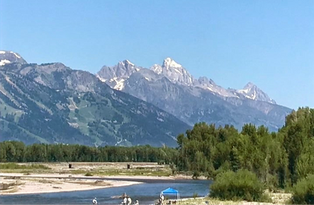 It's still really hot and now mid-afternoon. I take a few more pics downtown then decide to rally and drive thru Grand Teton National Park, to the Yellowstone boarder. I bought a year National Parks pass. The first section from Jackson Hole to Moran is 43 miles of flat, very gentle windy roads, alongside buffalo pastures. Speed limit is 55 mph. The 2nd leg is more forest, some of the road is hugging Jackson Lake. The views are beautiful. This drive is another 43 miles to the boarder of Yellowstone. I turn around at the boarder and will do Yellowstone another day. Most of the drive back is 45-55 mph. There isn't much traffic, but there are a few cars that pull over illegally to take pictures, making it dangerous to pass. Annoying.